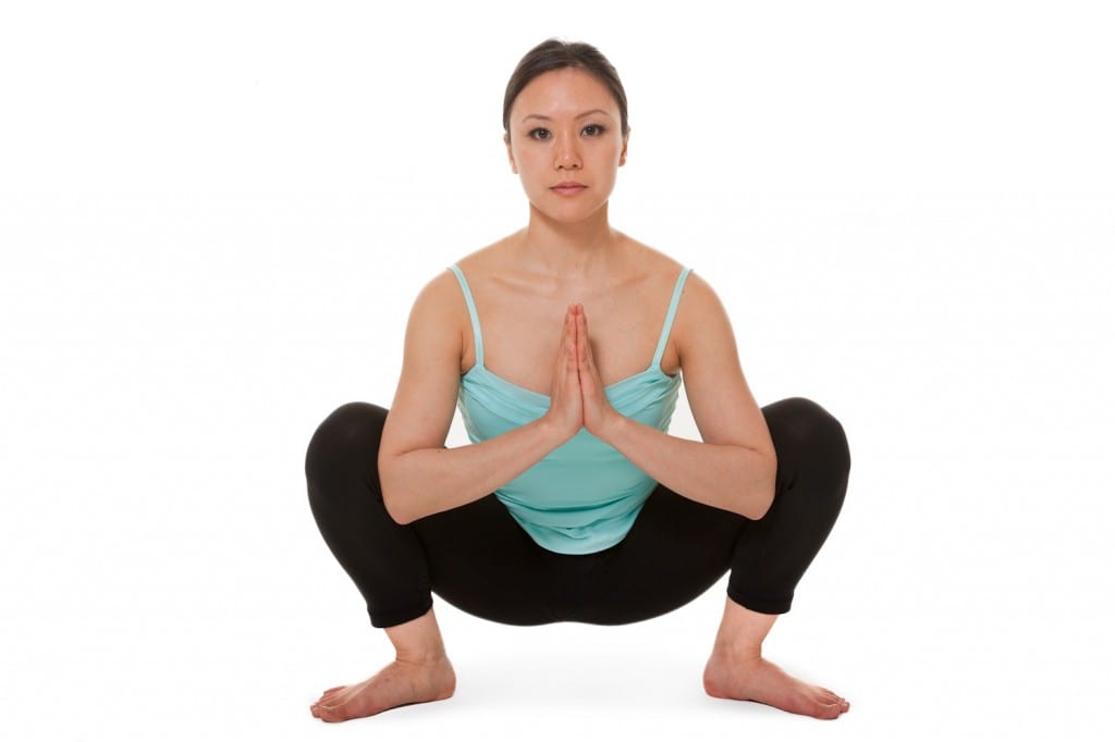 Malasana (Garland Pose). Take a wide squat with your knees apart. Place your hands in prayer, placing your elbows between your knees. You can place a rolled up blanket under your heels if your feet are not fully settled on the floor. This stretches your ankles and calves to let you push your heels towards the floor in Downward Dog