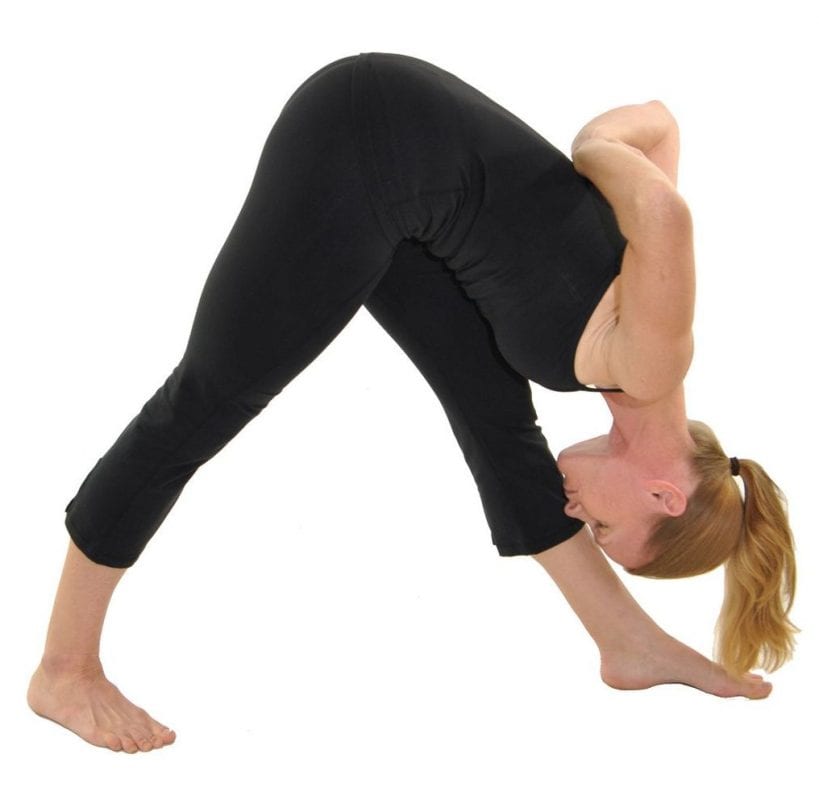 Parsvottanasana (Pyramid Pose). Here’s another great pose for strengthening the ankle and calves. Step one foot in front of the other keeping your hips and toes facing forward in a two-foot wide stance, keeping your heels in one line. With the hips square, lengthen the spine on an inhale, and begin to lower your forehead toward your shins on an exhale. You may rest your hands on a block or on the floor. You may also take your hands in reverse prayer behind your back.