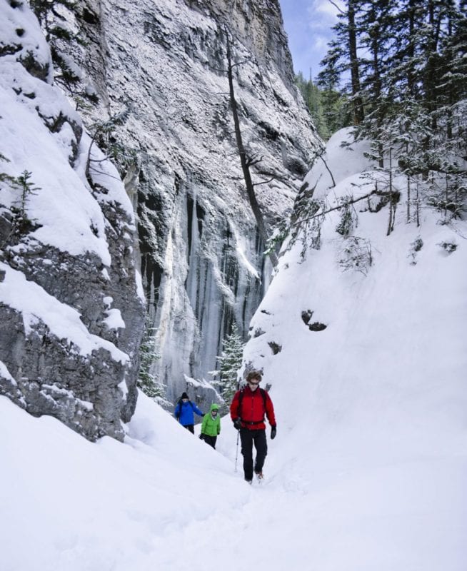 After breakfast, we were met by Claude who is the co-owner of Kananaskis Outfitters. We spent the next 3 hours enjoying the beauty of Kananaskis country on our hike up through Grotto Canyon. After a snowfall earlier in the week, everything was covered with a blanket of white and the waterfalls at the end of the trail had just started to freeze which created a beautiful photo opportunity (although this would be best leaving your camera at home so you could just enjoy the sights.)